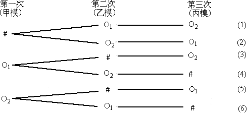 设三个小朋友分别是甲、乙、丙,抽签的次序是甲第一、乙第二、丙第三,三张纸条中带记号的记着“#”,另外两张不带记号的记着“O1”和“O2”.