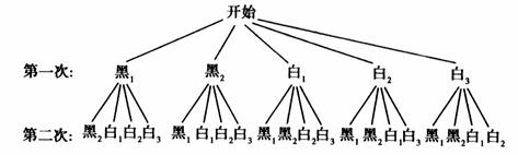从上面的树状图可以看出,可能出现的结果共有20种,都是等可能的,其中都是黑球的有2种,所以P(两次都是黑球)= .