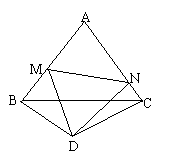 16、如图,△ABC是边长为1的等边三角形,△BDC是顶角∠BDC=120°的等腰三角形.以D为顶点作一个60°角,角的两边分别交AB于M,交AC于N,连接MN形成一个三角形,求证:△AMN的周长等于2.