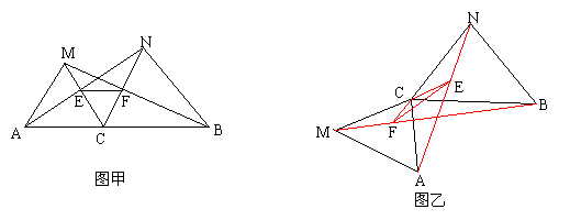 17、如图甲,点C为线段AB上一点,△ACM、△CBN是等边三角形,直线AN、MC交于点E,直线BM、CN交于点F.