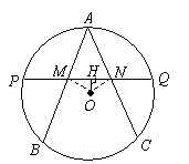 欲证PM=NQ,因为PQ为弦,容易联想到作弦心距OH,则PH=HQ.现只要证MH=HN即可.又M、N分别为弦AB、AC的中点,易知OM=ON,故原结论可证.