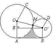 例6、如图,⊙O与⊙O′外切于点M,AB、CD是它们的外公切线,O′E⊥OA,垂足为E,且∠AOC=120°.