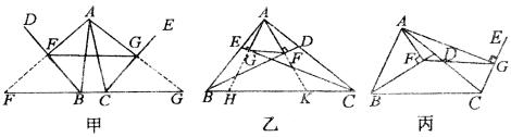 例1、已知,如图中甲图,BD、CE分别是△ABC的外角的平分线,过点A 作AF⊥BD,AG⊥CE,垂足分别为F,G,连结FG,延长AF、AG,与直线BC相交,易证 (1)若图甲BD,CE分别是△ABC的内角平分线(如图乙);(2)BD为△ABC的内角平分线,CE为△ABC的外角平分线(如图丙),则在图乙、图丙两种情况下,线段FG与△ABC三边又有怎样的数量关系?请写出你的猜想,并对其中的一种情况给予证明.