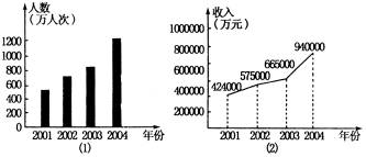 12、近年来,某市旅游事业蓬勃发展,吸引大批海内外旅客前来观光旅游、购物度假,下面两图 (1)(2)反映了该市2001—2004年游客总人数和旅游业总收入情况。