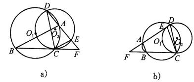 22.(12分)(2004年,江苏)如图a,⊙O2与⊙O1的弦BC切于C点,两圆的另一个交点为D,动点A在⊙O1上.直线AD与⊙O2交于点E,与直线BC交于点F.