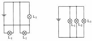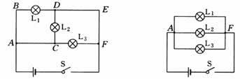 如图(2)所示的电路中,灯泡L1的右端、灯泡L2的左端及灯泡L3的上端共端,都连到电源的正极,而灯泡L1、L2和L3的另一端共端,都连接到电源的负极,于是可将原电路改画为图(2)所示,容易看出,灯泡L1、L2、和L3是并联的.