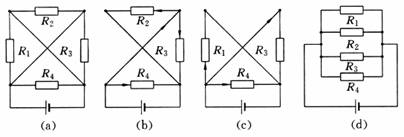 如图中(a)所示的电路,先拆除电阻R1,由(b)图可知R2、R3、R4中仍有电流.再拆除电阻R2,由图(c)可知R1、R2、R3、R4中仍有电流,同理可得,拆除电阻R3时,R1、R2、R4中仍有电流.拆除电阻R4时,R1、R2、R3中仍有电流.由拆除法的原理可知,四电阻之间的连接方式应是并联,电路图如图(d)所示.