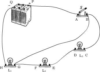 1、如图所示的电路中,小明同学由于疏忽出现了接线错误,致使_______灯不亮,试在图中再添加或去掉一根导线,使三灯均亮,此时三灯的连接方式是____________。