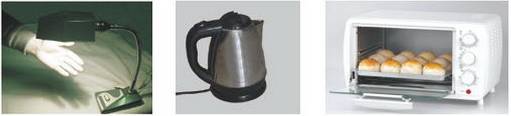 ①电熨斗:用来熨烫衣服使之平整的电热器。电熨斗按结构和功能分为普通型、调温型、喷雾型等。普通型电熨斗的基本构件是:发热体、底板、外壳、手柄等。在普通电熨斗上加上调温器和控温指示灯就构成调温型电熨斗,在调温型电熨斗上加上喷雾装置就构成了喷雾型电熨斗。