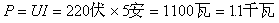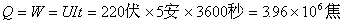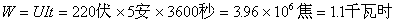 例1、一个电炉工作时的电压是220伏,电流是5安,求它在1小时内消耗多少千瓦时的电能?产生多少热量?
