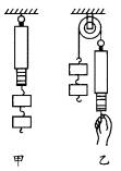 在图乙的实验中,滑轮不动,物体运动的方向与拉力的方向相反,弹簧测力计的示数G′与G相同.像这样滑轮工作时,中间的轴固定不动,这样的滑轮叫定滑轮.定滑轮不能省力但能够改变用力方向.