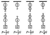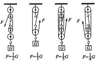 1°可以省力,也可以改变力的方向.使用滑轮组时,有几段绳子吊着物体(含动滑轮),提起物体所用的力就是物重的几分之一,即F= G物.