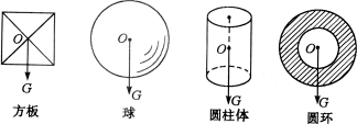 (2)重心。重力在物体上的作用点叫做重心。对于形状规则质地均匀的物体来说,重心一般在物体的几何中心上。如图所示的是几种形状规则质地均匀物体的重心。