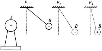 例2、(2004·黑龙江省)小明参观科技馆后,一组静电实验给他留下了深刻的印象,回来后他把实验情景绘成一幅平面示意图,图中A为放在绝缘支架上的带正电球体,B为用绝缘丝线悬吊的带正电的小球,先后将小球B悬吊在距离A球远近不同的P1、P2、P3处(图).