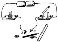 例8、(2002年,辽宁省大连市中考试题)如图所示,在开关和小灯泡之间连着两个金属夹A和B,在金属夹之间分别接入硬币、铅笔芯、大头针、橡皮,不能使灯泡发光的是( )