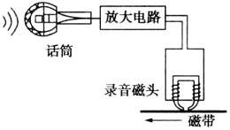 3、图是磁带录音机录音原理的示意图.录音时,动圈话筒将声信号转换为电信号送到录音磁头;录音磁头是一个蹄形电磁铁,它的磁性强弱随电信号变化,将电信号转换为磁信号;录音磁带贴着录音磁头移动,上面的磁粉被磁化,声音信号被记录在磁带上.关于磁带录音机录音过程,下列说法正确的是( )