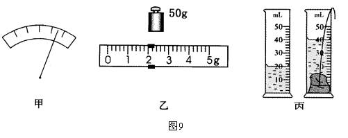 (1)调节天平横梁平衡时,发现指针在分度标尺上的位置如图9甲所示,此时应将平衡螺母向_______(选填“左”或“右”)调节。