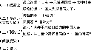 首先,作者揭示对方的论据和论点,然后直接反驳对方的论据和论点相脱节,出现论证的错误,接着正面立论、用不可否认的事实证明绝大多数中国人有自信心,指出对方犯了以偏概全的论证错误,最后作出结论,自信力的有无,不要被表面文章所迷惑,要透过现象看本质。