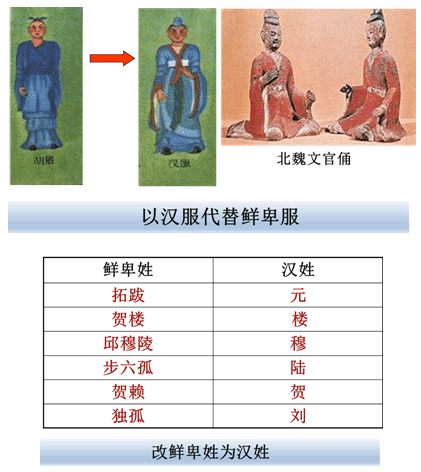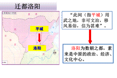 (3)内容:1)借鉴汉族的政治制度和经济制度,实施一系列新的制度,加强对经济和官吏的管理。2)迁都洛阳。3)推行学习汉族文化风俗的政策:改汉姓、穿汉服,与汉族通婚,说汉语、完善学校教育制度。