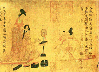 《女史箴》一文是西晋张华所作,其内容是教育封建宫廷女子们如何为人,如何自保的一些人生经验和道德箴条。顾恺之《女史箴图》画卷,展示了真实的宫廷生活。画中人物线条连绵不断、悠缓自然、节奏匀和(古人称之为“如春蚕吐丝”、“春云浮空,流水行地”),设色“傅染如浓色,微加点缀,不求晕饰”,形象端庄秀丽,从她们的身姿仪态中可以了解这些女子的身份和风采。