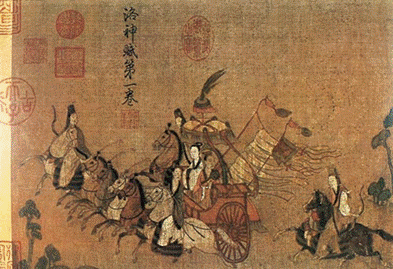 画中所描绘的洛神端庄美丽,时而徜徉于水面,“凌波微步”;时而飘忽遨游于云端,“仿佛兮,若轻云之蔽月,飘摇兮,若流风之回雪”,“翩若惊鸿,婉若游龙”,含情脉脉,仪态万千。洛神的一双眼睛,含情脉脉,似来又去,有无限的思慕愁怨之情。而岸边的曹植,则不失为一位贵族诗人,他雍容华贵,眼神里流露出深深的依恋和怅惘。