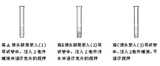 (2)取新鲜的馒头,切成大小相同的A、B、C3小块。将A、B两块分别用刀细细地切碎、拌匀(模拟牙齿的咀嚼和舌的搅拌功能),C块不做任何处理。
