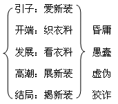 (4)虚伪昏庸。在参加游行大典时,他听到老百姓说了真话,十分恐慌。他摆出一副更骄傲的神气,来掩饰自己。