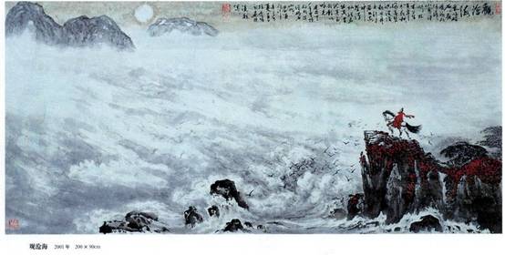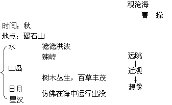 第二层(“水何澹澹”至“洪波涌起”):描写海水和山岛。 海水荡漾,山岛耸立——动静相映衬,显示了大海的辽阔和威严。 树木百草,秋风洪波——静动相配,显示了大海的惊人力量和宏伟气象。这一层全是写现实中的实景。