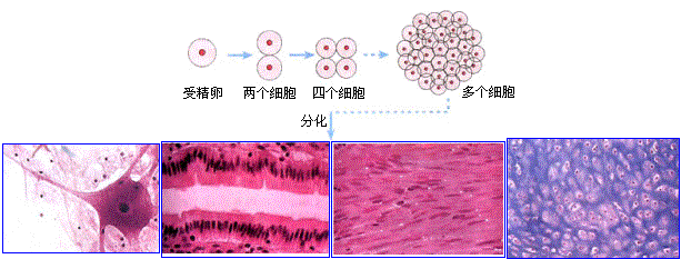 组织的形成是细胞分化的结果。细胞通过分裂产生新细胞。新细胞起初在形态和结构方面都很相似,并且都具有分裂的能力。随着细胞的增殖,细胞数量的增多,细胞的形态和功能也逐渐出现了差异。除了一小部分细胞依然保持着分裂能力外,大部分细胞失去了分裂能力。在生长过程中,这些细胞各自有了不同的功能,在形态结构上也逐渐发生了变化。最后形成了具有不同形态、不同功能的各种细胞。这种由一般到特殊,由相同到不同的细胞变化过程叫做细胞分化,其结果是形成各种组织。