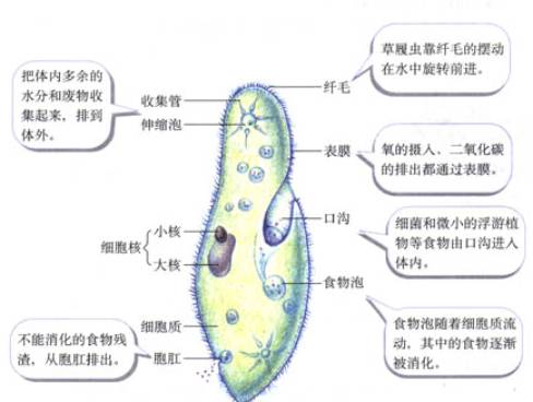 草履虫是生活在水中的单细胞生物,能够靠体表的纤毛的摆动而到处游动。从水中获得氧以及食物,产生的二氧化碳等废物也排入水中。它会通过细胞分裂产生新的草履虫。