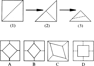 例1、(济南市)如图(1)所示,小强拿一张正方形的纸,沿虚线对折一次得图(2),再对折一次得图(3),然后用剪刀沿图(3)中的虚线剪去一个角,再打开后的形状是图中的( )
