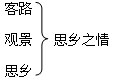 第一层次(前三句)作者用枯藤、老树、昏鸦、小桥、流水、人家、古道、西风、瘦马九种景物巧妙组合,向人们展示了一幅游子漂泊行旅图。