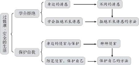本单元是由“共筑自我防护的堤防”的主体探究活动和两课教材──第八课“学会拒绝”和第九课“保护自我”构成。其中第八课“学会拒绝”是由两框,即“身边的诱惑”和“学会拒绝不良诱惑”共五个目题内容组成;第九课“保护自我”是由两框,即“身边的侵害与保护”和“防范侵害,保护自己”共五个目题内容组成。