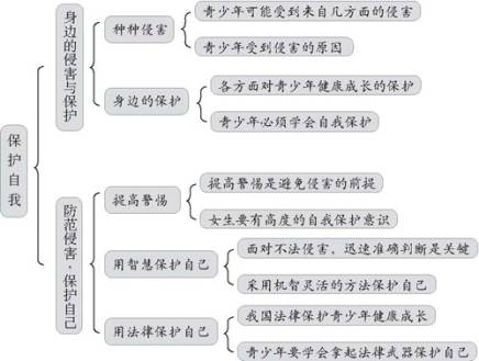 第一框“身边的侵害与保护”,主要以实例介绍了在日常生活中,中学生可能受到来自家庭、学校、社会和司法等方面的侵害;指出虽然我们能得到来自家庭、学校、社会等方面的保护,但学会自我保护是未成年人迈向成熟的重要一步。