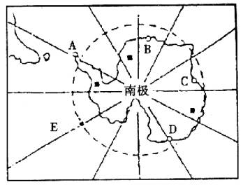 解题的突破口在于:A为我国建于乔治王岛的科学考察站长城站,其经度为60°W,根据图中相邻的两条经线相隔30°这一有效信息,根据经度判定方法,在图中画出顺时针箭头表示地球自转方向。顺地球自转方向,经度值递减的为西经度,递增的为东经度。可判断E点经度为120°W;并可判断B位于0°经线附近,临大西洋;D在150°E附近,临太平洋;C则临印度洋,由此可以认定位于南极圈以内有极昼极夜现象的C站为我国中山站,滨印度洋;“由南极点吹向D点的风”实质上是南半球的极地东风,风向应为东南风;由于人类活动排放出大量氯氟烃,使南极地区上空和北极地区上空都出现了臭氧层空洞,与酸雨、全球变暖成为全人类共同关心的环境问题。南极洲曾地处气候暖热湿润的温带地区,那时森林茂盛,后由于地壳运动。森林被埋于地层中,经成煤作用形成了煤炭,后由于大陆漂移方到达目前所处南极地区。