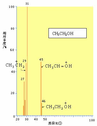质荷比:有机物分子在高能电子流的轰击下形成的分子离子和碎片离子的相对分子质量与其所带电荷的比值。(横坐标上最大的分子离子即为该有机化合物的相对分子质量)