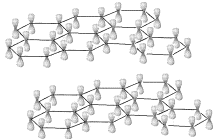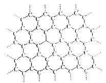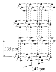 石墨不同于金刚石,它的碳原子不像金刚石的碳原子那样呈sp3杂化,而是呈sp2杂化,形成平面六元并环结构(如图左),因此,石墨晶体是层状结构的,层内的碳原子的核间距为142pm,层间距离为335pm,说明层间没有化学键相连,是靠范德华力维系的(如图中);石墨的二维结构内,每个碳原子的配位数为3,有一个未参与杂化的2p电子,它的原子轨道垂直于碳原子平面(如图右)。
