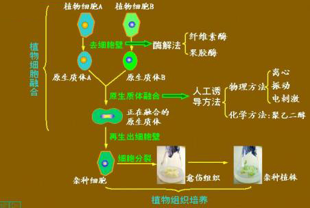 (1)概念:是用两个来自于不同植物的体细胞融合成一个杂种细胞,并且把杂种细胞培育成新的植物体的方法。