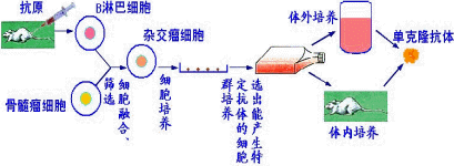 (1)单克隆抗体:指由单个B细胞进行无性繁殖(克隆)形成细胞群,由这种细胞群产生的化学性质单一、特异性强的抗体。 (2)制备过程: