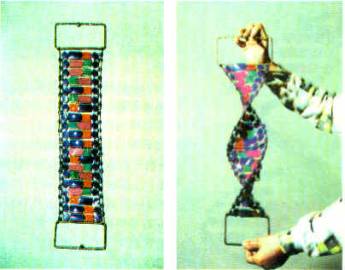 将两条多核苷酸链模型的末端铁丝分别固定在两块硬塑料方框上,背面再用两根较粗的铁丝加固,用两手将两硬塑料框拉紧,即得DNA分子的平面结构模型。拉直双链后再旋转一下,即得DNA分子的双螺旋结构。