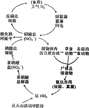 (3)、生物固氮:是最重要的固氮途径。大约占地球固氮的90%。能够进行固氮的生物主要是固氮菌,与豆科植物共生的根瘤菌和蓝藻等自养和异养微生物。氮的循环可用下图表示: