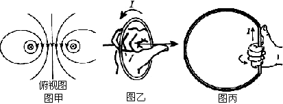 环形电流磁场的磁感线是一些围绕环形导线的闭合曲线,在环形的中心轴上,由对称性可知,磁感线是与环形导线的平面垂直的一条直线。如图甲所示,环形电流方向与磁感线方向的关系也可以用右手定则来判断,如图乙所示,让右手弯曲的四指和环形电流的方向一致,伸直的大拇指所指的方向就是圆环轴线上磁感线的方向;如图丙所示,让右手握住部分环形导线,伸直的大拇指与电流方向一致,则四指所指的方向就是围绕环形导线的磁感线的方向。