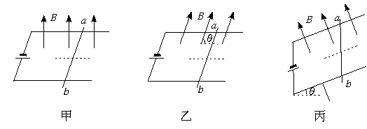 题目所给的图是立体图,如果直接把ab棒受到的安培力画在立体图上则较为抽象.为了直观,一般画成平面图,对图15-2-1中的各个图从外向内看的正视平面图如图15-2-2所示(此时导体ab是一个横截面图, 表示电流向里,⊙表示电流向外),图15-2-2甲中,I与B决定的平面是与纸面垂直的竖直面,安培力方向与这个平面垂直,由左手定则知,安培力的方向为水平向右.图15-2-2乙中,I与B决定的平面是与水平方向成θ角的垂直纸面的平面,安培力方向与这个平面垂直,指向右下方.图15-2-2丙中,I和B决定的平面是垂直斜面的平面,安培力方向与斜面平行,指向右上方(各图安培力的方向如图15-2-2中所示).