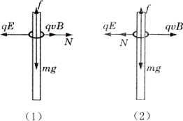 要求出环在下滑过程中的最大加速度和最大速度,必须要了解环在整个下滑过程中的运动情况和受力情况。首先应对环进行受力分析,环在下滑过程中受到竖直向下的重力、水平向左的电场力、水平向右的洛伦兹力、水平方向的弹力和竖直向上的摩擦力。当环刚开始下滑时,环的速度很小,洛伦兹力也很小,环所受的电场力大于洛伦兹力。所以弹力的方向水平向右,环向下做加速运动,随着环的速度增大,环所受的洛伦兹力也增大,环所受的弹力变小,滑动摩擦力也变小,环在竖直方向所受的合力增大,环做加速度变大的加速运动,当环所受的洛伦兹力等于电场力时,弹力为零,滑动摩擦力也为零,此时,环在竖直方向的合力达到最大,加速度达到最大,为重力加速度g。随着环速度的进一步增大,环所受的洛伦兹力将大于电场力,弹力的方向变为水平向左,并随着洛伦兹力的增大而增大,环所受的滑动摩擦力增大,环在竖直方向所受的合外力变小,环做加速度变小的加速运动,当环所受的滑动摩擦力等于环的重力时,环的加速度为零,速度达到最大,接下去环将做匀速直线运动。