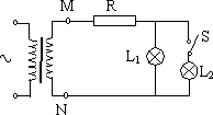 电键 K接通时,L1、L2两灯并联,电阻小,副线圈与电阻R、灯泡组成的回中电流增大,电阻R上电压增大,UMN不变,灯L1上的电压减小,通过L1的电流减小。