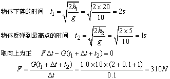 例3、质量为m=1.0kg的小球从h1=20m高处自由下落到水平地面上,反弹后上升的最大高度为h2=5.0m,小球与地面作用的平均时间为△t=0.1s.求在接触时间内,小球受到的平均作用力。