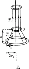 例5、如图所示,三根不可伸长的轻绳,一端系在半径为r0的环1上,彼此间距相等,绳穿过半径为r0的第3个圆环,另一端用同样方式系在半径为2r0的圆环2上,环1固定在水平面上,整个系统处于平衡,试求第2个环中心与第3个环中心之距离。(三个环都是用同种金属丝制作的,摩擦不计)