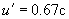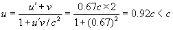 例4、当两个电子沿着相反的方向飞离一个放射性样品时,每个电子相对于样品的速度均为0.67c,求两个电子的相对速度.