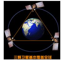 通信卫星工作的基本原理如图所示。通信卫星的运行轨道有两种。一种是低或中高轨道,另一种轨道是高达36000km的同步定点轨道,即在赤道平面内的圆形轨道,卫星的运行周期与地球自转一圈的时间相同,在地面上看这种卫星好似静止不动,称为同步卫星。卫星通信系统由通信卫星(空间部分)和地面部分(通信地面站)两大部分构成。在这一系统中,通信卫星实际上就是一个悬挂在空中的通信中继站。它居高临下,视野开阔,它可以“看”到地球最大跨度达18000km以上。三颗卫星(如图)就可以覆盖地球的几乎全部面积,可进行24小时的全天候通信。只要在它的覆盖照射区以内,不论距离远近都可以通信,通过它转发和反射电报、电视、广播和数据等无线信号。通信卫星的种类也越来越多。按服务区域划分,有全球、区域和国内通信卫星。按用途分,有一般通信卫星、广播卫星、海事卫星、跟踪和数据中继卫星以及各种军用卫星等。