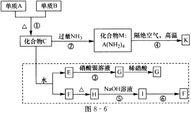 24、(9分)材料科学是近年来与化学有关的科学研究的热点。某新型无机非金属材料K由两种非金属元素组成,它是一种超硬物质,具有耐磨、耐腐蚀、抗冷热冲击、抗氧化的特性。它是以中学化学中的常见物质为原料来生产的,图8-6中虚线框外为其生产过程;虚线框内的其他转化是为探究C的组成而设,F、H均为难溶于水的白色固体;图8-6中C、M、K均含A元素,其余物质均为中学化学中常见的物质。